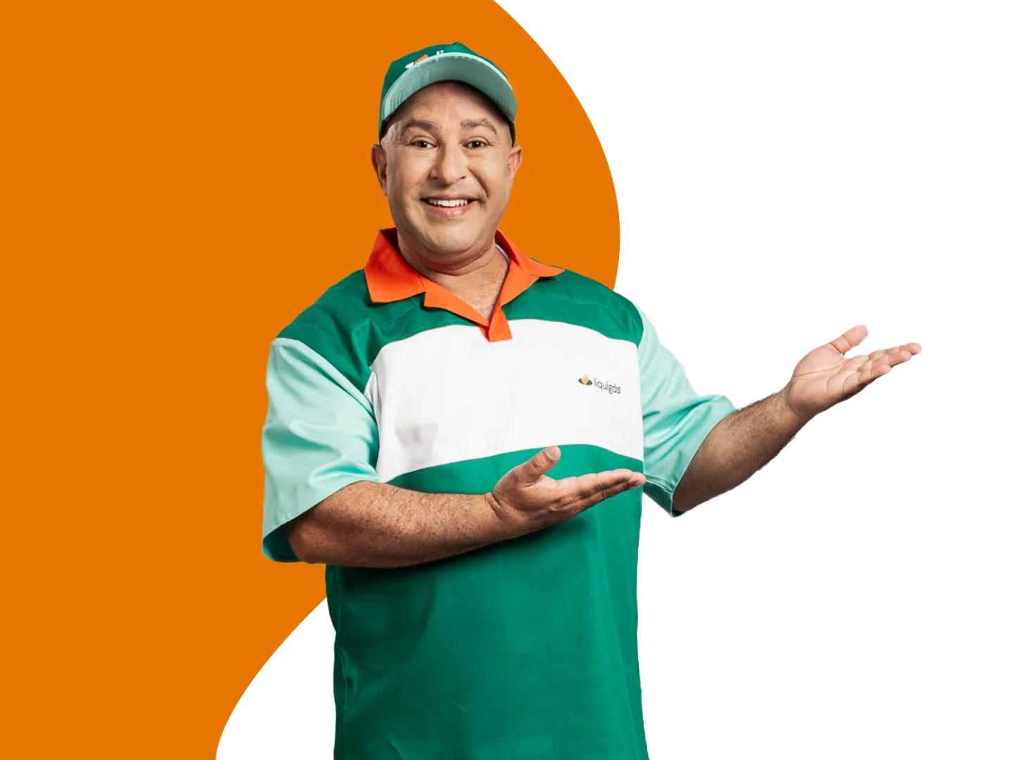 Entregador da Liquigás uniformizado, sorrindo e apresentando os serviços.